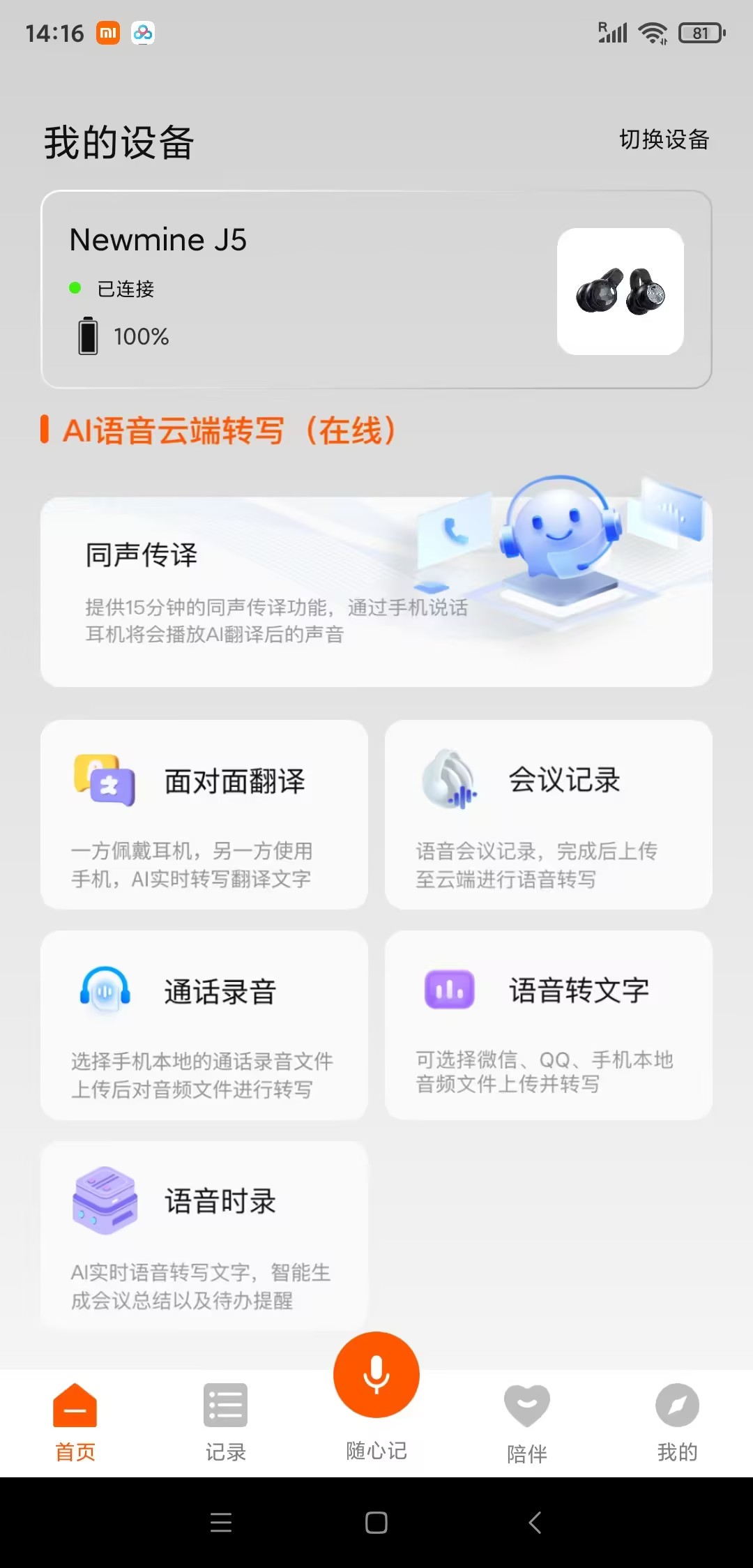 设备配对,提供同声传译、面对面翻译、会议记录、通话录音转文字等服务。用户可通过手机进行实时语音转写,智能生成会议总结和待办事项,提升工作沟通效率。