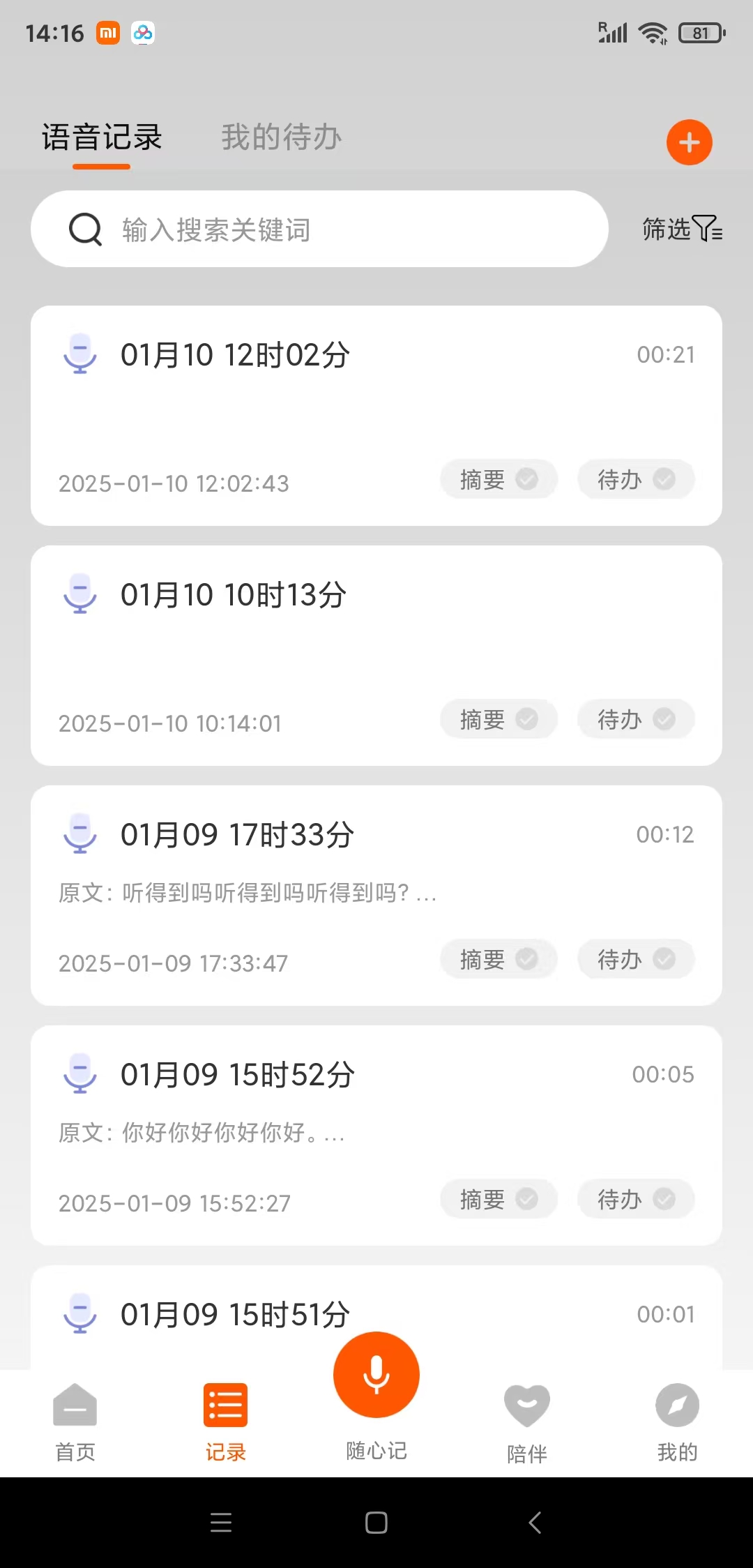 功能允许用户录制、存储并回顾语音信息。每条记录都带有时间戳和原文,用户可以为每条记录创建摘要或标记为待办事项。通过搜索和筛选功能,用户可以轻松找到所需的语音记录,提高信息管理的效率。适用于会议记录、学习笔记等多种场合。