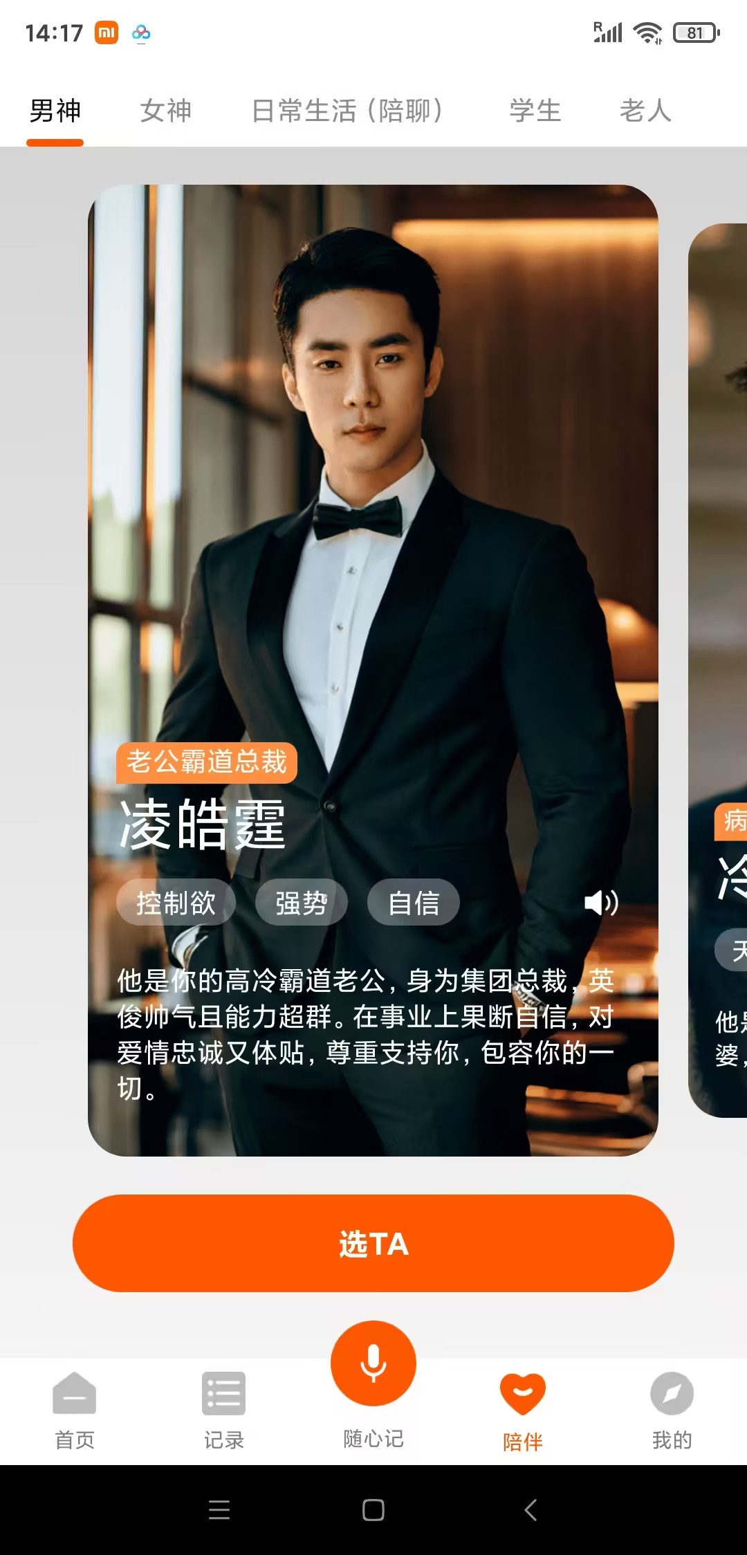 提供个性化的虚拟角色互动,如“霸道总裁”凌皓霆,他以高冷、强势的形象出现,同时在爱情中表现出忠诚和体贴。用户可以通过选择不同的角色来体验多样化的交流,满足不同情感需求,享受模拟社交的乐趣。适合寻求情感支持或新社交体验的用户。