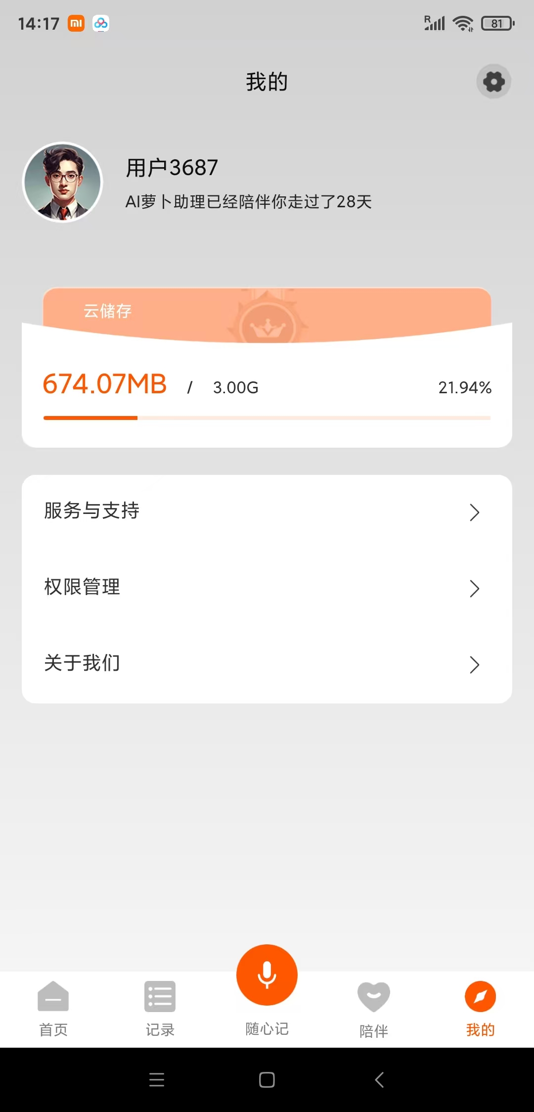 提供用户信息概览和云存储管理。云存储界面还包含服务与支持、权限管理和关于我们等选项,方便用户获取帮助、管理应用权限和了解应用详情。底部导航栏涵盖首页、记录、随心记、陪伴和个人中心,确保用户轻松管理个人信息和使用各项功能。